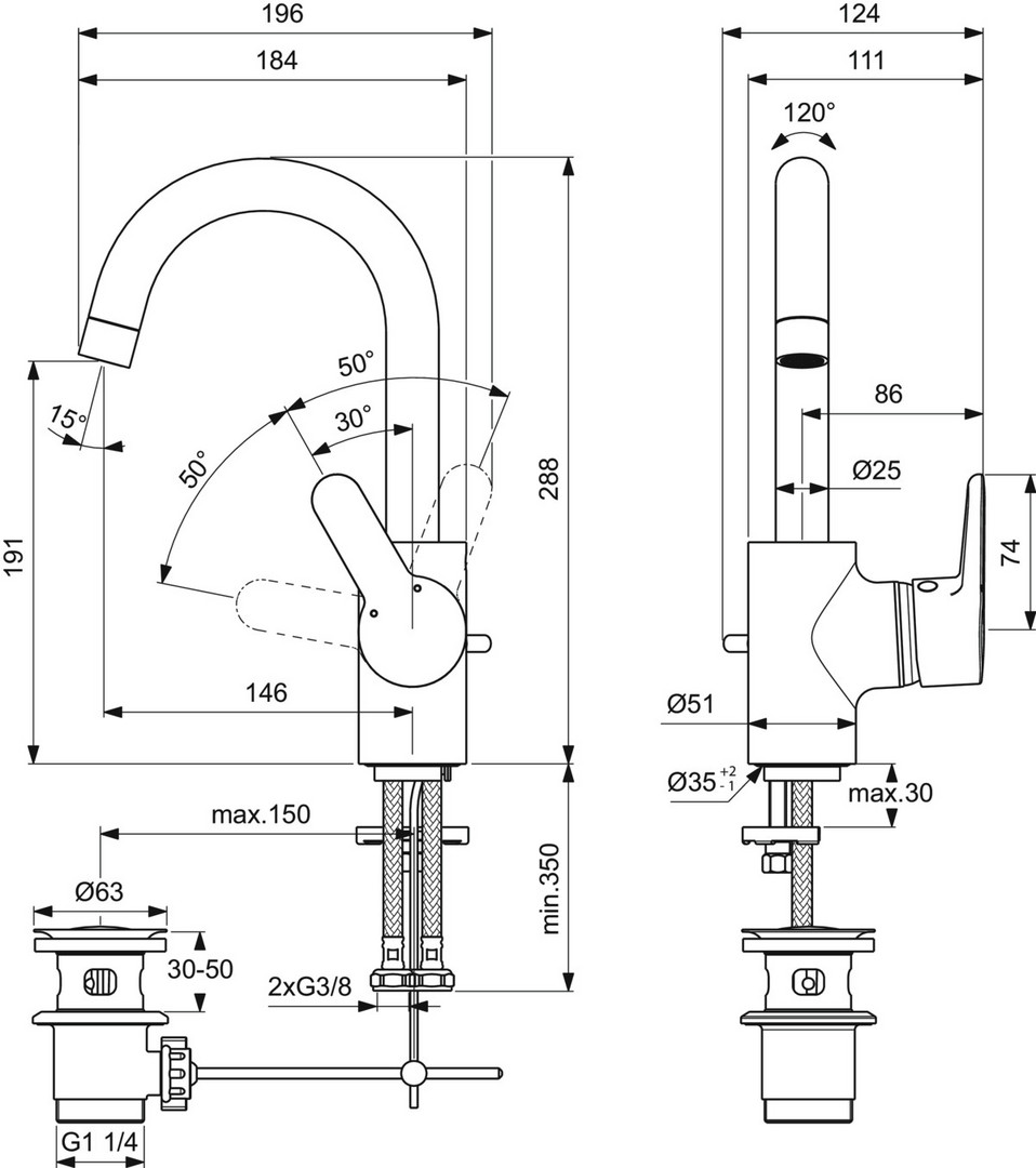 DN 15, Auslaufhöhe 191 mm, Luftsprudler (sichtbar), Metall-Zugstangen-Ablaufgarnitur G 1 1/4, flexible Anschlussschläuche G 3/8, Griff aus Metall mit Rot-/Blau-Markierung, Schnellmontagesystem, Kartusche Ø 40 mm, CLICK-Kartusche mit keramischen Dichtscheiben, Kartuschenschwenkbereich 90°, Kartuschenübersetzung aus Edelstahl, Heißwassertemperaturbegrenzer, Schwenkbereich Auslauf 360°, Norm DIN EN 248, Geräuschverhalten DIN 4109 Gruppe 1, Lebensdauer DIN EN 817, DIN EN 200