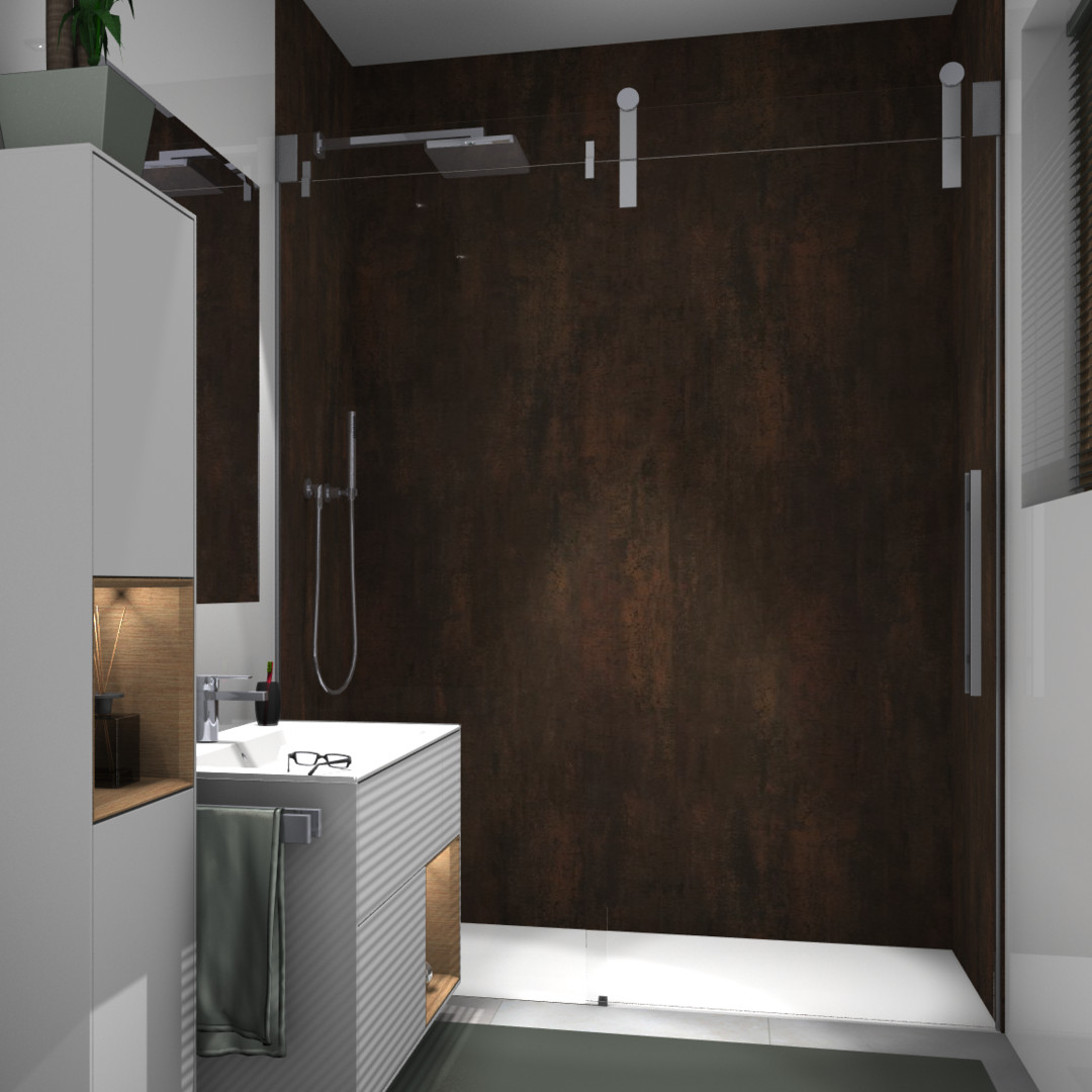 Glas 8 mm ESG transparent, Glaszarge 13 mm VSG, Standardhöhe Oberkante Glaszarge 2120 mm (Glaszarge 120 mm) plus 55 mm für Laufrollen, ein Teil fix, ein Teil schiebbar, optional mit 8 mm hoher Schwallschiene, PALM.free, PALM.fix, PALM.pro, PALM.motion, PALM.isi-clean, optional PALM.nano, PALM.care, schmales Wandprofil zur Montage auf oder in Fliese