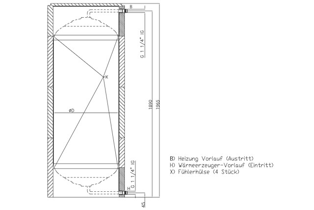einsetzbar als Durchlaufspeicher (2 Anschlüsse), 2 Tauchrohre für die Einbringung von bis zu 4 Fühlern, Position variabel, abnehmbare Hartschaumisolierung, Abmessungen 650 x650 x1965/780 x 780 x 1965 mm, Einbringmaße Ø 547 x 1935/Ø 677 x 1935 mm, Kippmaß 2030/2070 mm, Speicherinhalt Netto 323/493 l, Gewicht ca. 40/50 kg, max. Volumenstrom 5000 l/h, max. zul. Speichertemperatur 90 °C, max. zul. Betriebsdruck 3 bar, max. zul. Speicherprüfdruck/20 °C 4,5 bar (Prüfung nur mit Wasser zulässig), Baustoffklasse B2