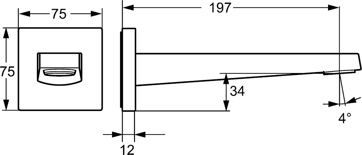 Heißwasserversorgung max. 80°C, Durchfluss bei 3 bar 39 l/min, Anschlussgröße G1/2, Ausladung 197 mm, Material Messing, integrierter Strahlregler, ohne Mundstück direkt in den Armaturenauslauf geschraubt, Armaturenkörper aus entzinkungsbeständigem Messing (DZR), feststehender Auslauf, gegossen, Rosette eckig