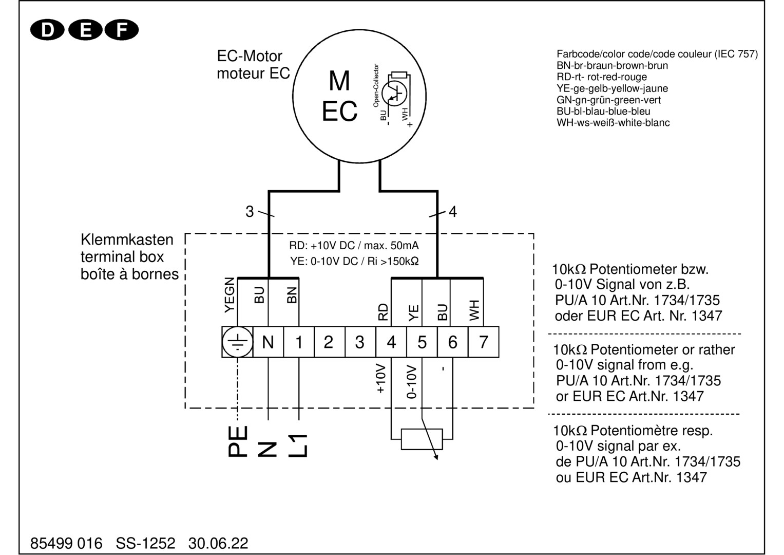 Gehäuse aus verzinktem Stahlblech, Laufrad mit profilierten Schaufeln aus Kunststoff, dynamisch ausgewuchtet, EC-Außenläufermotor in Schutzart IP 54 (wartungs- und funkstörungsfrei), integrierte elektronische Temperaturüberwachung für EC-Motor und Elektronik, serienmäßiger Klemmkasten (Schutzart IP 54) am ausgeführtem Kabel montiert, Einbau in jeder Lage möglich