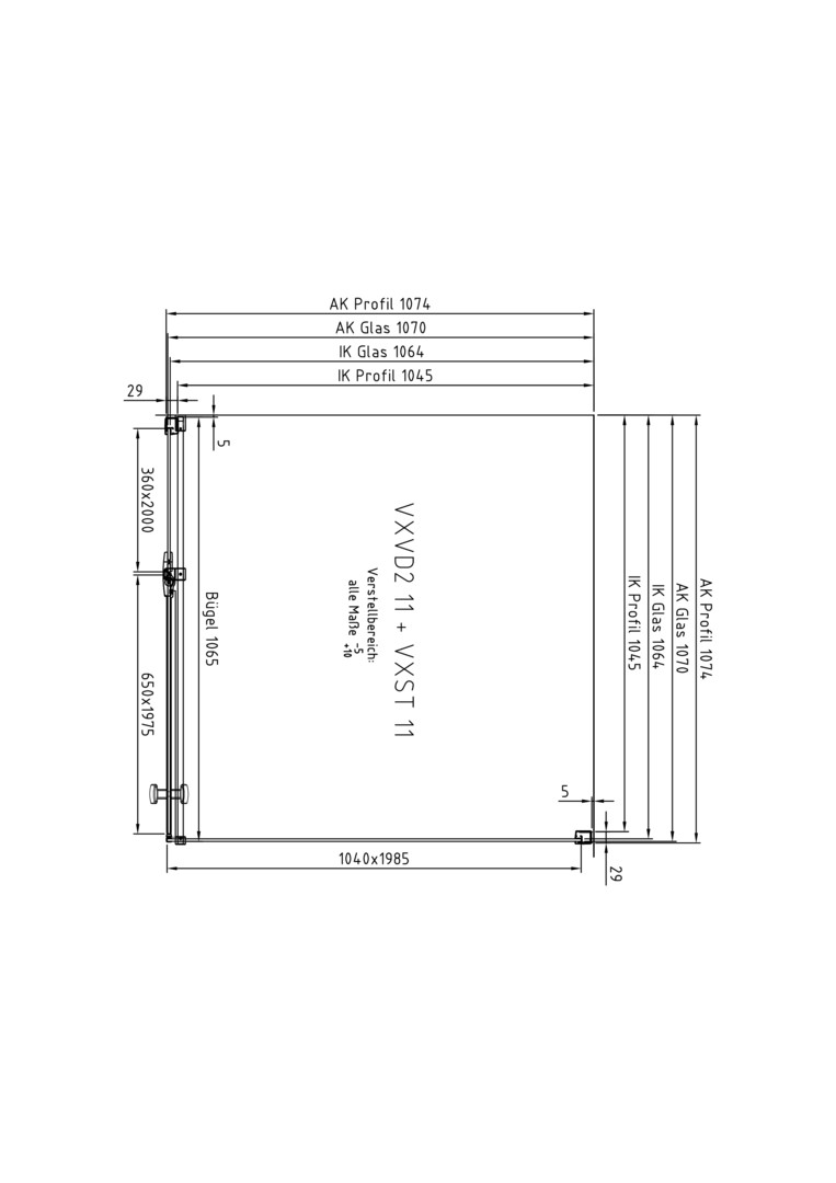 | Einbaubreite Tür für die Montage mit Seitenwand | 1085 - 1100 mm |