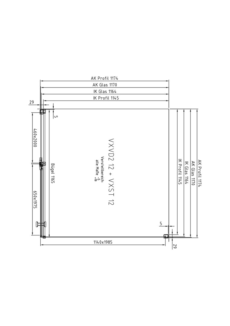 | Einbaubreite Tür für die Montage mit Seitenwand | 1185 - 1200 mm |