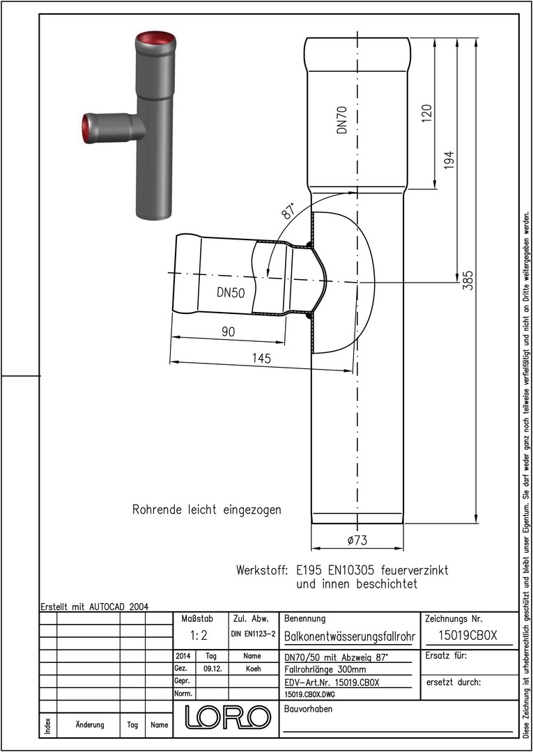 LORO X Entwässerungsfallrohr DN 70/50, 300 mm, mit Abzweig 87Grad