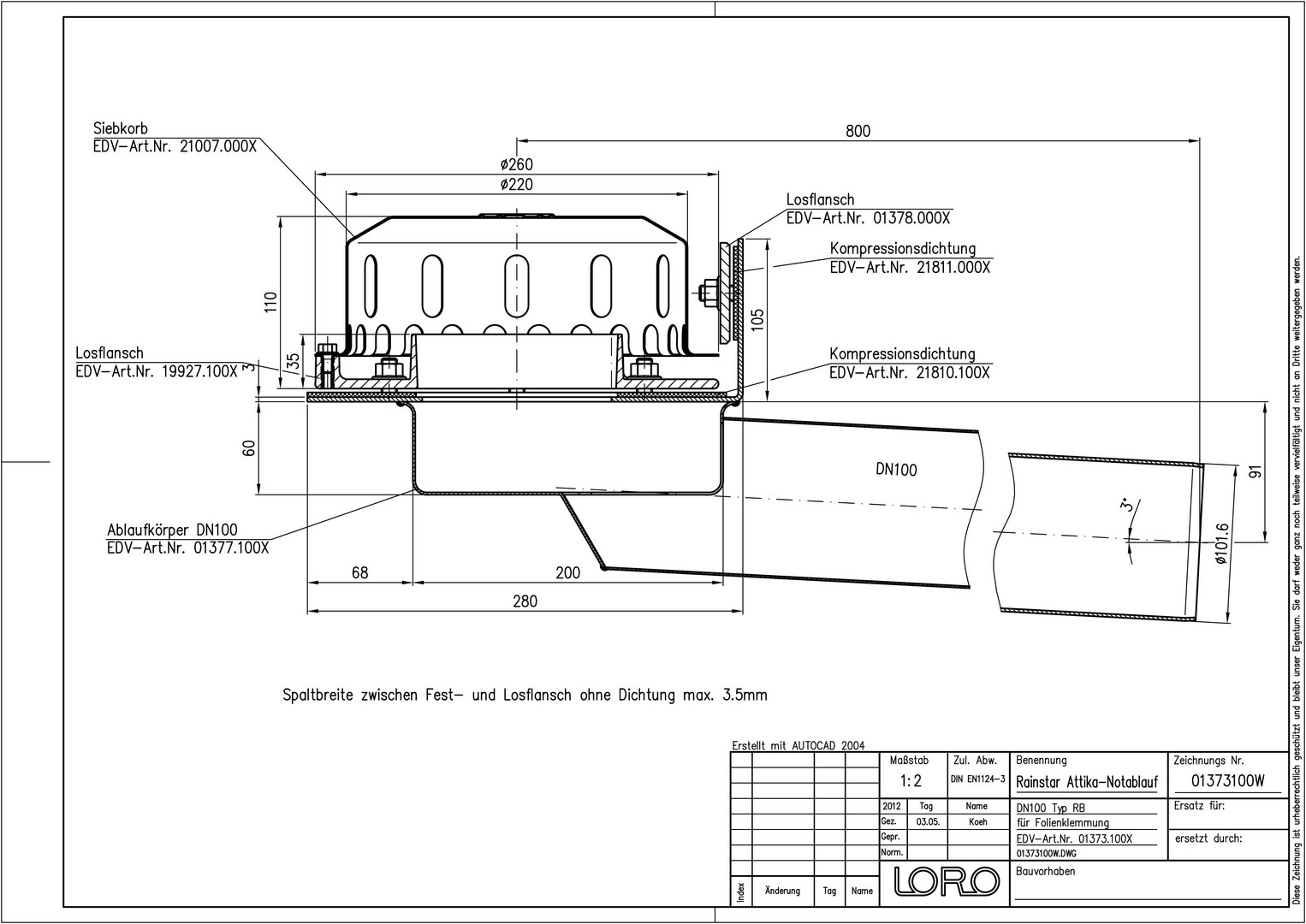 LORO Attika Ablauf Rainstar Serie 79 (RB) Klemmflansch 45°, für Bitumen-Dachabdichtungsbahnen, DN 100, Notablauf W558536