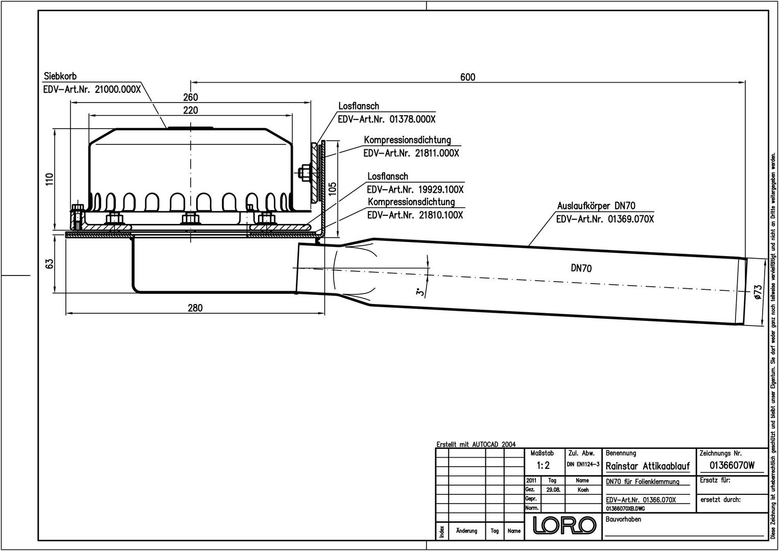 LORO Attika Ablauf Rainstar Serie 89 Klemmflansch 90°, für Kunststoff-Dachabdichtungsbahnen, DN 70, Druckströmung W558527