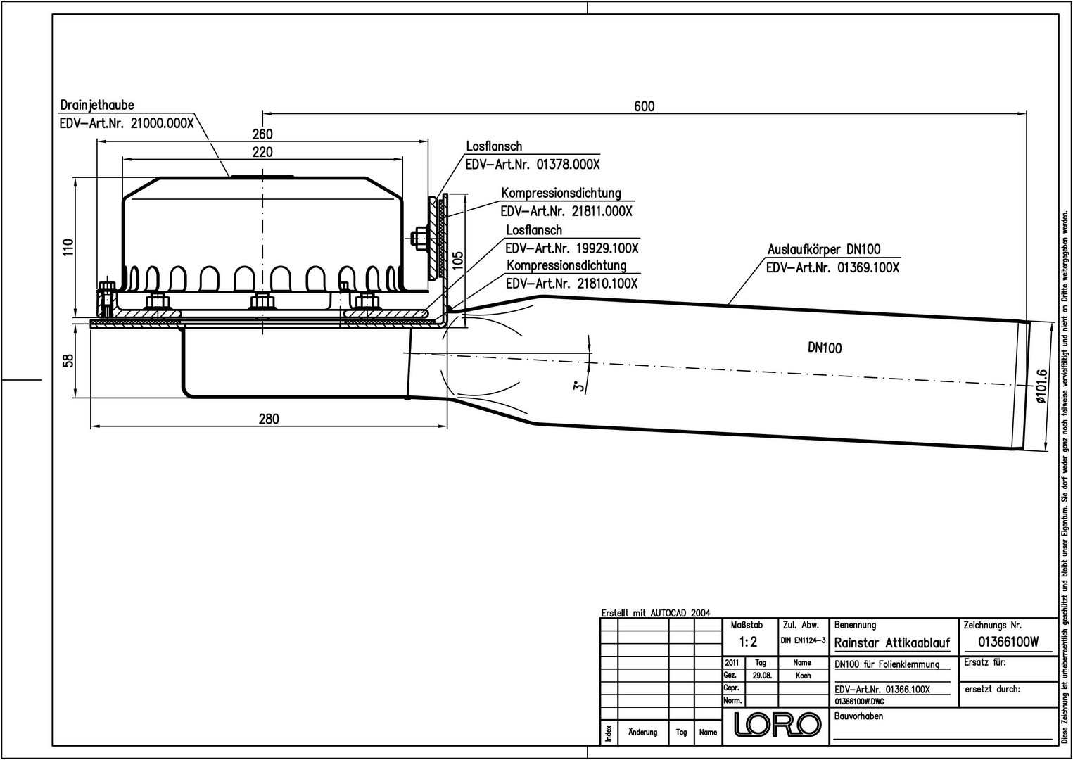 LORO Attika Ablauf Rainstar Serie 89 Klemmflansch 90°, für Kunststoff-Dachabdichtungsbahnen, DN 100, Druckströmung W558528