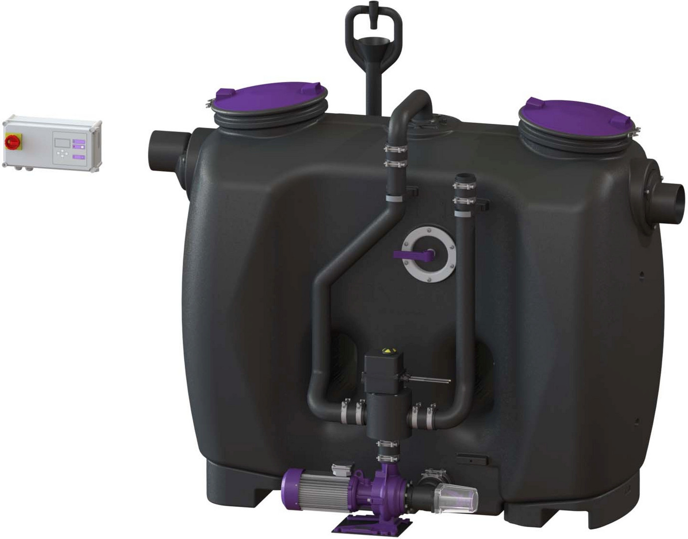 aus PE, Einbau in frostgeschützten Räumen, mit programmgesteuerter Entsorgungs- und Reinigungseinrichtung, Schredder-Mix-System, Schaltgerät, Schauglas, Fülleinrichtung, Pumpe und Trinkwasserspülung, die Fließrichtung kann durch Austauschen des Zu- und Ablaufstutzens geändert werden, Pumpenleistung 3 kW, Kabellänge für Anbauteile 5 m, Anlage komplett montiert, Zubehör Probeentnahmeeinrichtung, Hebeanlagen, Fernbedienung
