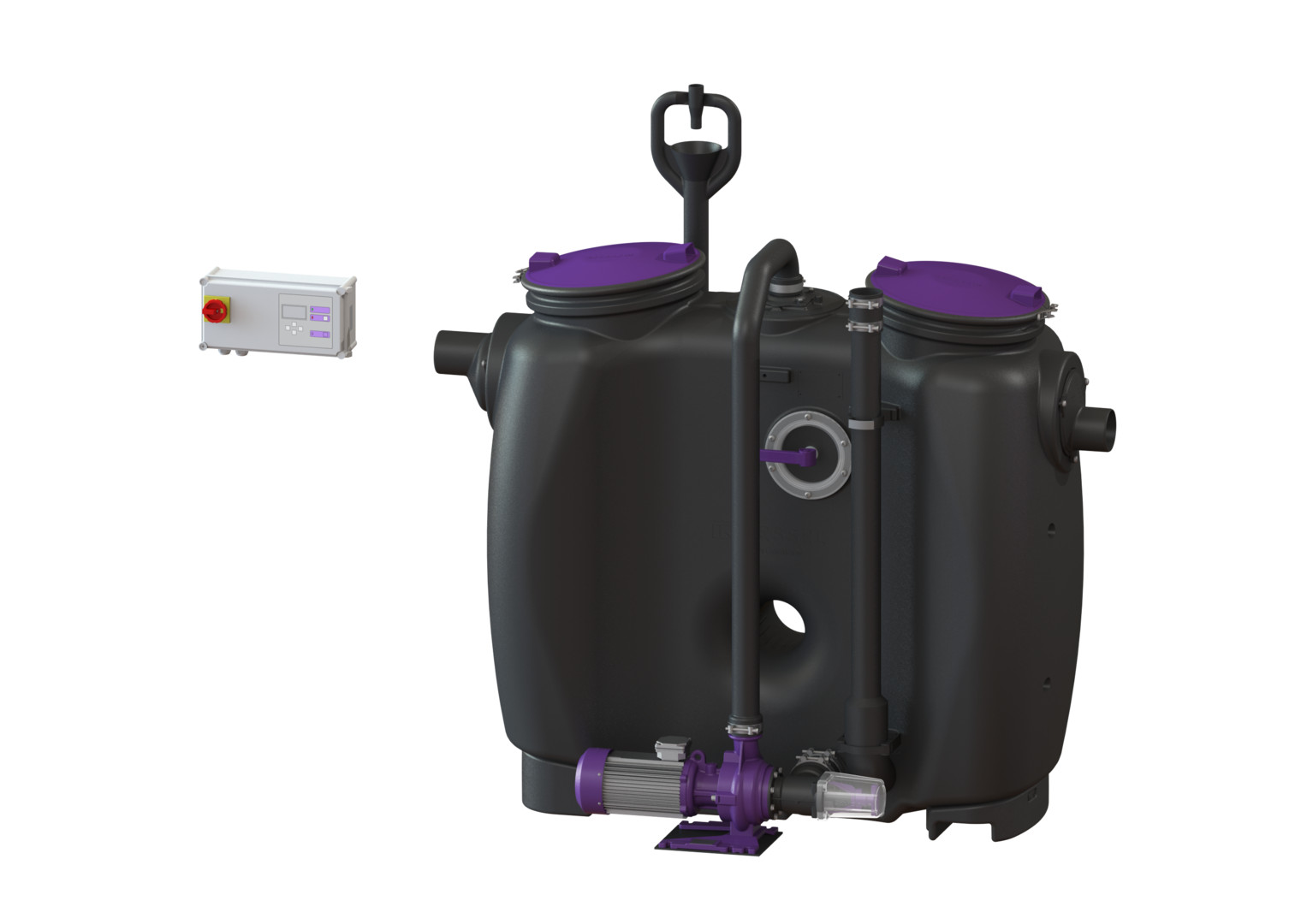 aus PE, Einbau in frostgeschützten Räumen, mit Direktentsorgung, programmgesteuertem Schredder-Mix-System, Schaltgerät, Schauglas, Fülleinrichtung und Pumpe, die Fließrichtung kann durch Austauschen des Zu- und Ablaufstutzens geändert werden, Pumpenleistung 3 kW, Kabellänge für Anbauteile 5 m, Anlage komplett montiert, Zubehör Probenahmeeinrichtung, Hebeanlagen, Fernbedienung