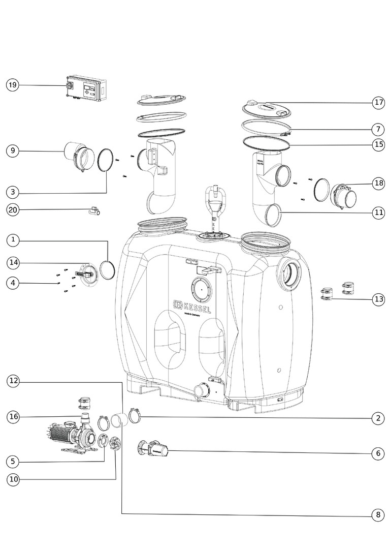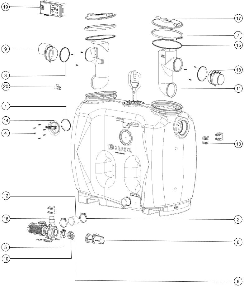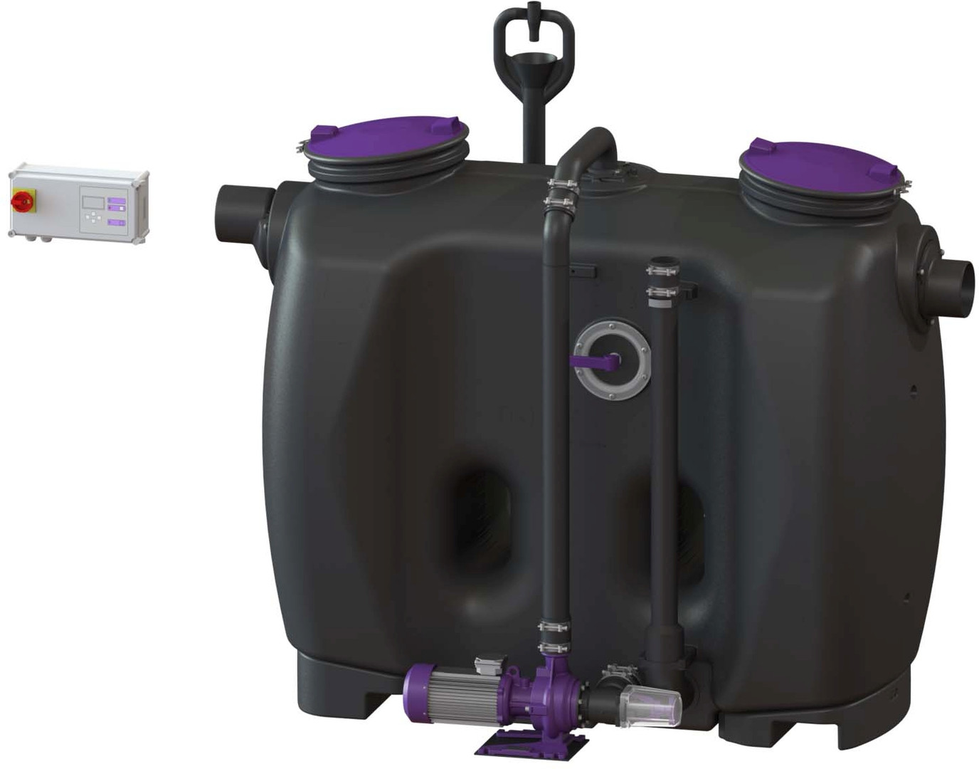 aus PE, Einbau in frostgeschützten Räumen, mit Direktentsorgung, programmgesteuertem Schredder-Mix-System, Schaltgerät, Schauglas, Fülleinrichtung und Pumpe, die Fließrichtung kann durch Austauschen des Zu- und Ablaufstutzens geändert werden, Pumpenleistung 3 kW, Kabellänge für Anbauteile 5 m, Anlage komplett montiert, Zubehör Probenahmeeinrichtung, Hebeanlagen, Fernbedienung
