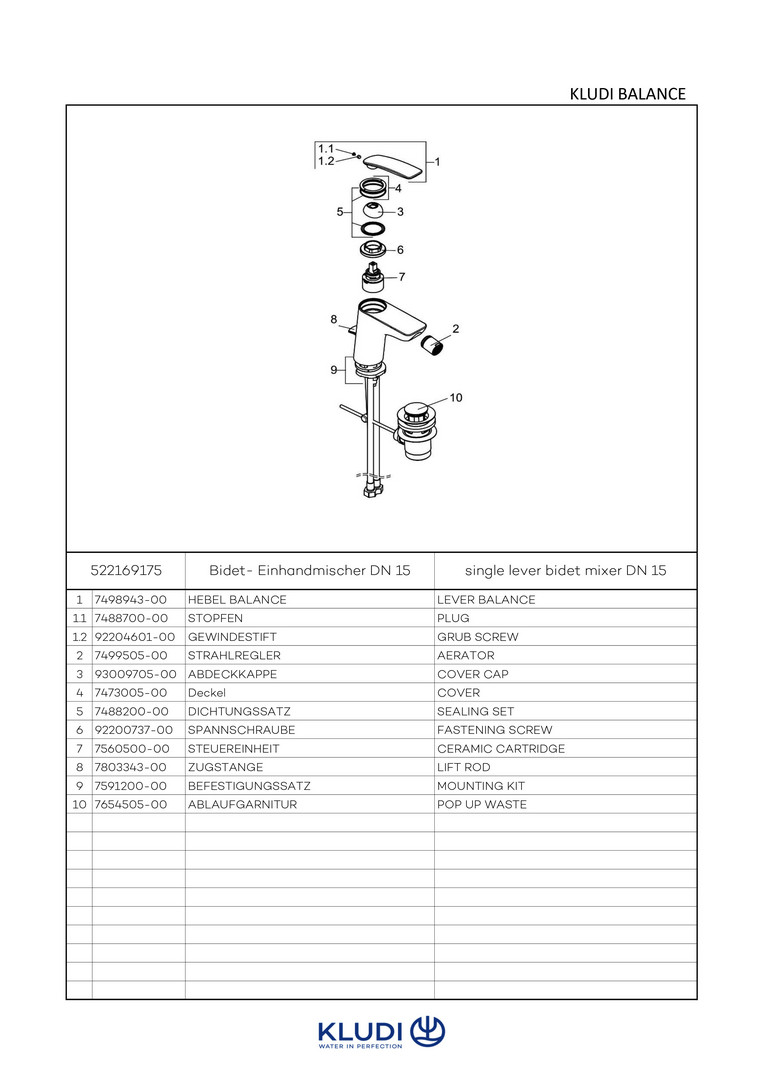 KLUDI Balance Bidet-Einhebelmischer mit Ablaufgarnitur, weiß/chrom