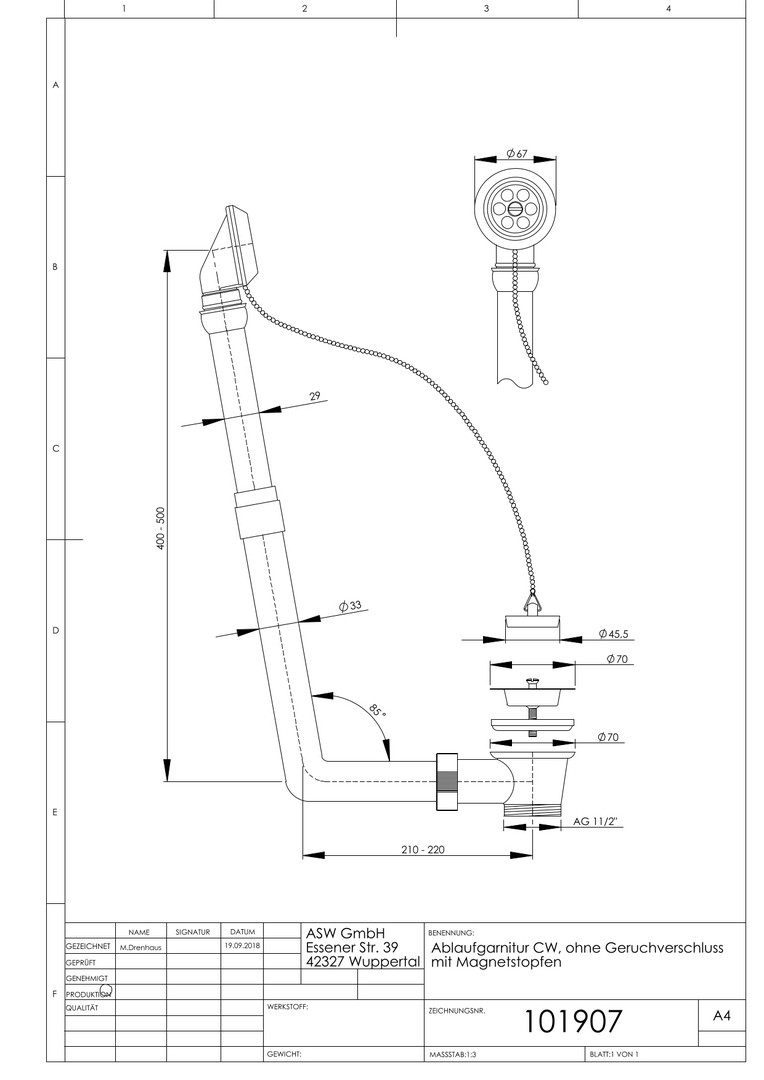 ASW Ablaufgarnitur CW mit Magnetstopfen, ohne Geruchsverschluss