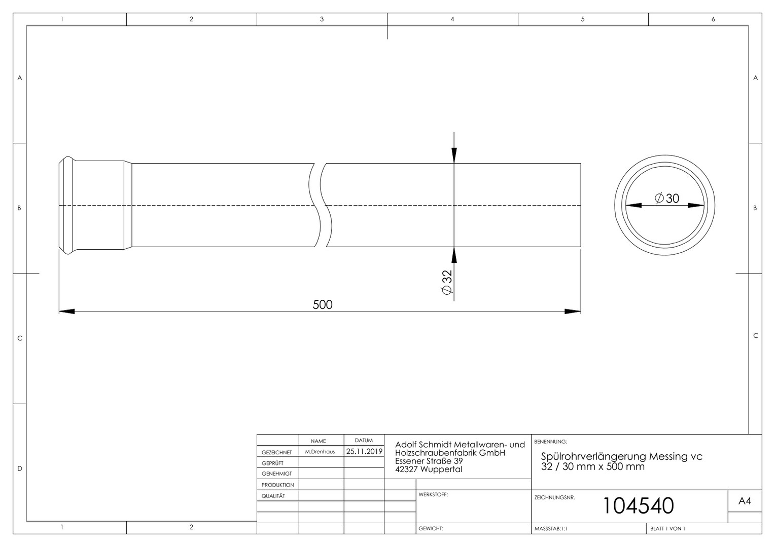 ASW Spülrohrverlängerung 32/30 x 500 mm, DN 25, 1", Messing verchromt, mit O-Ring
