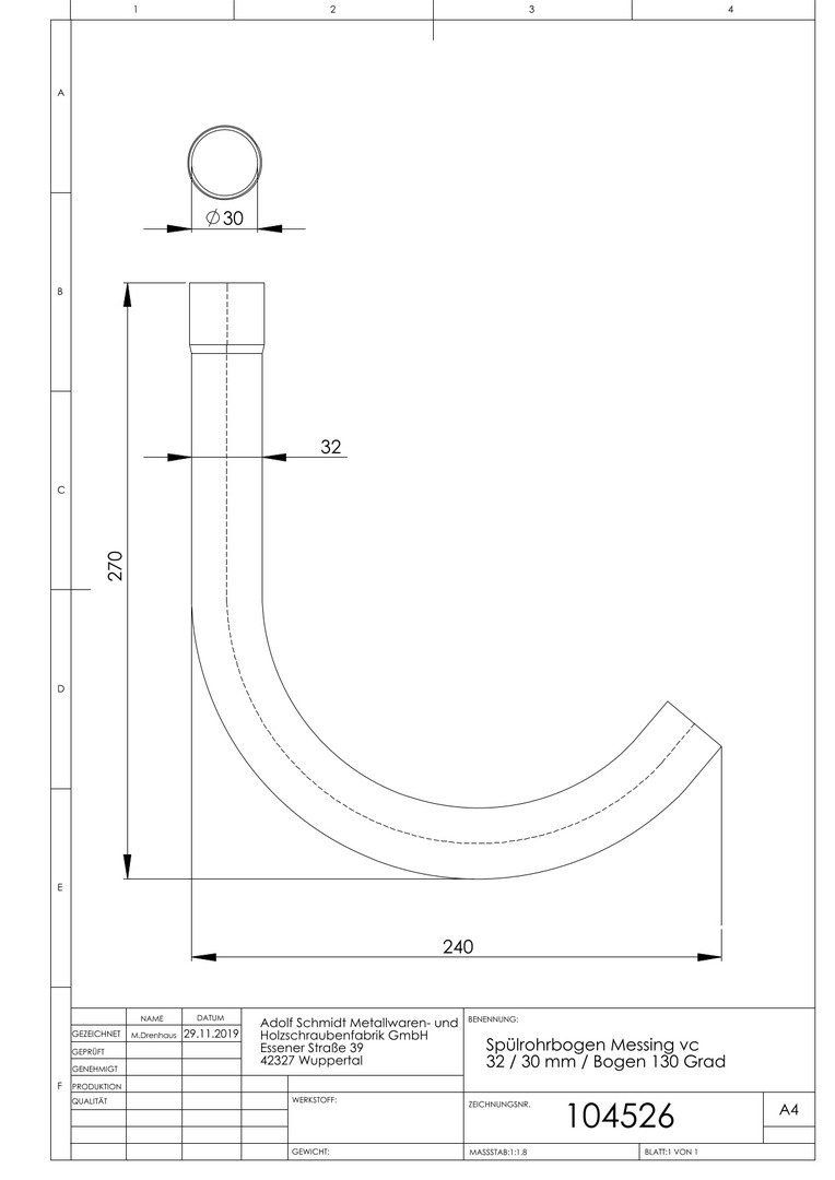 ASW Spülrohrbogen 32/30 mm, 130°, DN 25, 1", Messing verchromt