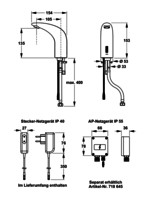 berührungslose, infrarotgesteuerte Waschtischarmatur ohne Mischung, für die Entnahme von kaltem und vorgemischtem Leitungswasser aus dem Trinkwassernetz, Einsatzbereich Innen, 154 x 153 x 53 mm, Ausladung 105 mm, für Lochstanzung Ø 35 mm, zur Montage auf Waschtisch oder Arbeitsplatte (Stärke 2-40 mm), in Messing aus chromglanz, Armaturengruppe I nach DIN EN 200, Schutzart IP 55, zur Standmontage, Durchflussbegrenzer 6 l/min, vandalensicher, Strahlregler M24, Infrarot-Näherungselektronik, bistabiles Magnetventil 6 V, Betriebsdruck 0,5-8 bar, max. Auslauftemperatur 60 °C, Nachlaufzeit einstellbar von 0,5-10 s (Werkseinstellung 1 s), automatischer Auslaufstopp einstellbar von 60-180 s (Werkseinstellung 60 s), zuschaltbare periodische Hygienespülung (einstellbar in 10 Intervallstufen von 24-240 h), Dauer Hygienespülung einstellbar von 30-120 s, Reinigungsstopp Dauer 60 s, einstellbare Funktionen über Sanicontrol-Fernbedienung SC 900 (Nachlaufzeit, Auslaufstopp, Hygienespülung, Ansprechbereich), für Edelstahlbecken geeignet, nachrüstbar, ohne Ablaufgarnitur, geeignet für druckfeste elektronische Durchlauferhitzer, nicht geeignet für druckfeste hydraulische Durchlauferhitzer, bestehend aus 1x Armatur mit integrierter Infrarot-Näherungselektronik und Magnetventil, Befestigungsmaterial, 1x flexibler Anschlussschlauch R 3/8 (Länge 400 mm), 1x Rückflussverhinderer, 1x Schmutzfangsieb, 1x Flachdichtung 3/8", 1x Stecker-Netzteil 230 VAC/6 VDC-Art.-Nr. 718 840/1x Batteriegerät 6 VDC, Schutzart IP 65 (zur Montage unter dem Waschtisch) und 4x Batterien Typ LR6 1,5 V-Art.-Nr. 718 841, 1x Sanicontrol-Fernbedienung SC 900