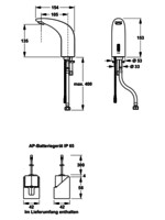 berührungslose, infrarotgesteuerte Waschtischarmatur ohne Mischung, für die Entnahme von kaltem und vorgemischtem Leitungswasser aus dem Trinkwassernetz, Einsatzbereich Innen, 154 x 153 x 53 mm, Ausladung 105 mm, für Lochstanzung Ø 35 mm, zur Montage auf Waschtisch oder Arbeitsplatte (Stärke 2-40 mm), in Messing aus chromglanz, Armaturengruppe I nach DIN EN 200, Schutzart IP 55, zur Standmontage, Durchflussbegrenzer 6 l/min, vandalensicher, Strahlregler M24, Infrarot-Näherungselektronik, bistabiles Magnetventil 6 V, Betriebsdruck 0,5-8 bar, max. Auslauftemperatur 60 °C, Nachlaufzeit einstellbar von 0,5-10 s (Werkseinstellung 1 s), automatischer Auslaufstopp einstellbar von 60-180 s (Werkseinstellung 60 s), zuschaltbare periodische Hygienespülung (einstellbar in 10 Intervallstufen von 24-240 h), Dauer Hygienespülung einstellbar von 30-120 s, Reinigungsstopp Dauer 60 s, einstellbare Funktionen über Sanicontrol-Fernbedienung SC 900 (Nachlaufzeit, Auslaufstopp, Hygienespülung, Ansprechbereich), für Edelstahlbecken geeignet, nachrüstbar, ohne Ablaufgarnitur, geeignet für druckfeste elektronische Durchlauferhitzer, nicht geeignet für druckfeste hydraulische Durchlauferhitzer, bestehend aus 1x Armatur mit integrierter Infrarot-Näherungselektronik und Magnetventil, Befestigungsmaterial, 1x flexibler Anschlussschlauch R 3/8 (Länge 400 mm), 1x Rückflussverhinderer, 1x Schmutzfangsieb, 1x Flachdichtung 3/8", 1x Stecker-Netzteil 230 VAC/6 VDC-Art.-Nr. 718 840/1x Batteriegerät 6 VDC, Schutzart IP 65 (zur Montage unter dem Waschtisch) und 4x Batterien Typ LR6 1,5 V-Art.-Nr. 718 841, 1x Sanicontrol-Fernbedienung SC 900