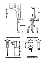 berührungslose, infrarotgesteuerte Waschtischarmatur mit Mischerhebel, für die Entnahme von kaltem und warmen Leitungswasser aus dem Trinkwassernetz, Einsatzbereich Innen, für drucklose Elektro-Speicher-Wassererwärmer, 154 x 153 x 53 mm, Ausladung 105 mm, für Lochstanzung Ø 35 mm, zur Montage auf Waschtisch oder Arbeitsplatte (Stärke 2-40 mm), aus Messing in chromglanz, Armaturengruppe I nach DIN EN 200, Schutzart IP 55, zur Standmontage, Durchflussbegrenzer 4,5 l/min, vandalensicher, Strahlregler M24, Infrarot-Näherungselektronik, bistabiles Magnetventil 6 V, Betriebsdruck 0,5-8 bar, max. Auslauftemperatur 60 °C, Nachlaufzeit einstellbar von 0,5-10 s (Werkseinstellung 1 s), automatischer Auslaufstopp einstellbar von 60-180 Sek. (Werkseinstellung 60 Sek.) zuschaltbare periodische Hygienespülung (einstellbar in 10 Intervallstufen von 24-240 h), Dauer Hygienespülung einstellbar von 30-120 s, Reinigungsstopp Dauer 60 s, einstellbare Funktionen über Sanicontrol-Fernbedienung SC 900 (Nachlaufzeit, Auslaufstopp, Hygienespülung, Ansprechbereich), für Edelstahlbecken geeignet, nachrüstbar, Temperatur über Mischerhebel einstellbar, ohne Ablaufgarnitur, nicht geeignet für druckfeste Durchlauferhitzer, bestehend aus 1x Armatur mit integrierter Infrarot-Näherungselektronik und Magnetventil, Befestigungsmaterial, 3x flexible Anschlussschläuche R 3/8 (Länge 400 mm), 1x Rückflussverhinderer, 1x Schmutzfangsieb, 3x Flachdichtungen 3/8", 1 Stecker-Netzteil 230 VAC/6 VDC-Art.-Nr. 718 844/1x Batteriegerät 6 VDC, Schutzart IP 65 (zur Montage unter dem Waschtisch) und 4x Batterien Typ LR6 1,5 V-Art.-Nr. 718 845, 1x Montageschlüssel für Strahlregler, 1x Sanicontrol-Fernbedienung SC 900