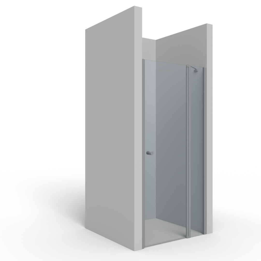Türelement 4 mm ESG transparent, Standardhöhe 1800 mm, Tür öffnet nach innen und außen, optional mit 4 mm hoher Wasserschwallleiste (nicht im Lieferumfang enthalten), PALM.free, PALM.fix, PALM.lift, PALM.invisible, PALM.isi-clean, optional PALM.nano, PALM.care, Fixteil aus 5 mm ESG transparent, mit 45° Wandverstrebung