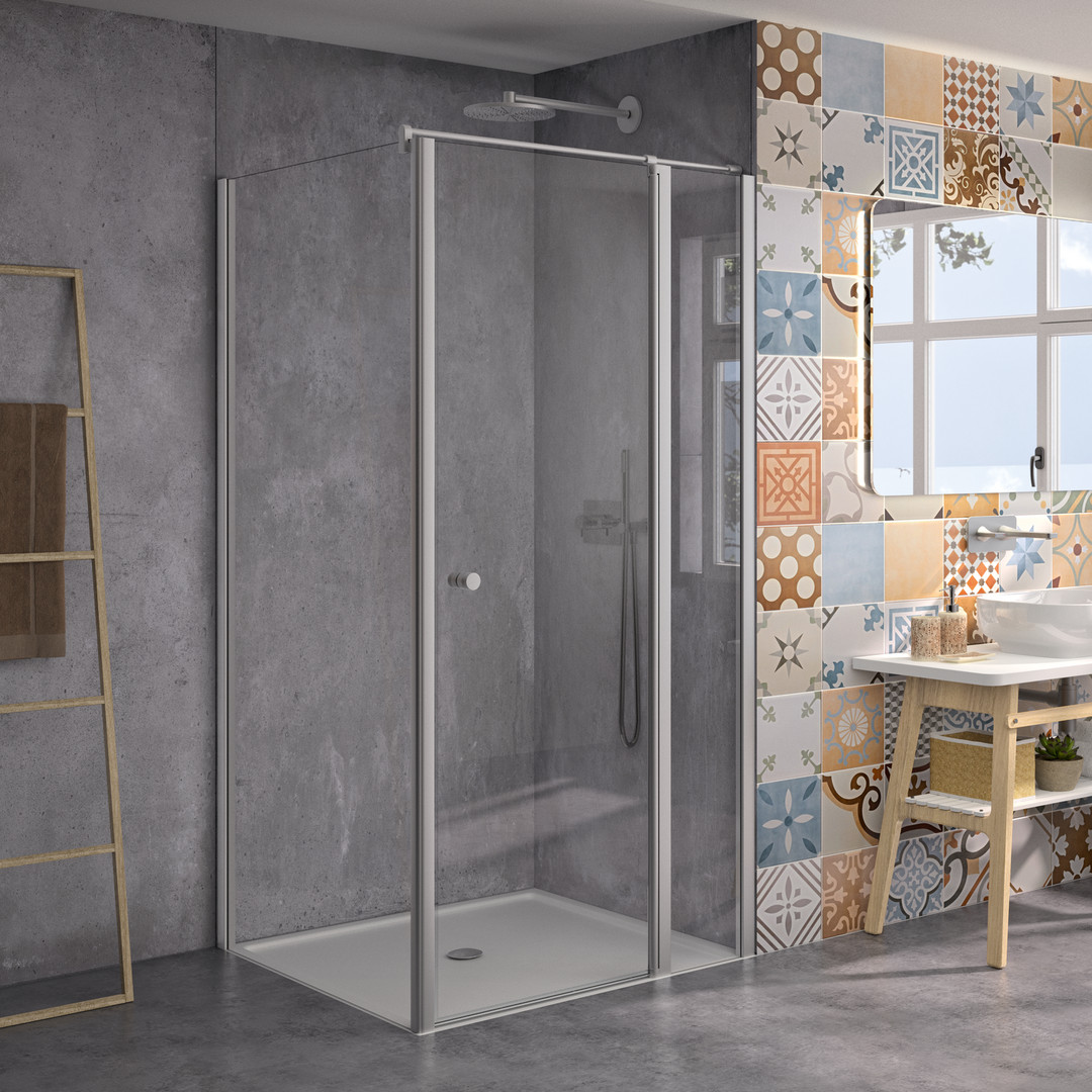 Türelement 4 mm ESG transparent, Standardhöhe 1800 mm, Tür öffnet nach innen und außen, optional mit 4 mm hoher Wasserschwallleiste (nicht im Lieferumfang enthalten), PALM.free, PALM.fix, PALM.lift, PALM.invisible, PALM.isi-clean, optional PALM.nano, PALM.care, Fixteil aus 5 mm ESG transparent, mit 45° Wandverstrebung