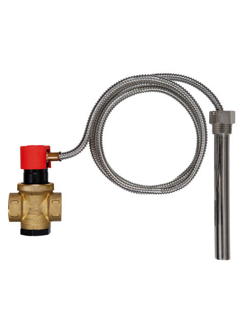 mit 2 voneinander unabhängigen Fühlersystemen, bestehend aus einem Ventilgehäuse, Hubventil, 2 unabhängigen Faltenbalgweggebern mit flüssigkeitsgefüllten Temperaturfühlern und einer Tauchhülse, das Kapillarrohr ist geschützt durch flexiblen Metallschlauch, die TAS wird in den Warmwasserabgang des Warmwasserbereiters oder am Eingang des Sicherheitswärmetauschers angeschlossen, bei Überschreiten der Ansprechtemperatur wird das Hubventil durch den thermischen Weggeber geöffnet, Kühlwasser aus dem Leitungsnetz zugeführt und somit ein Überschreiten der maximal zulässigen Betriebstemperatur verhindert, Betriebsdruck max. 10 bar, Temperatureinsatzbereich Umgebung 80 °C, Ansprechtemperatur 99 °C, Abblasleistung bei 110 °C= 1 bar > 2,4 cbm/h, Anschlüsse 2x G 3/4 Innengewinde, Anschluss Tauchrohr G1/2 Außengewinde, Tauchrohrlänge 146 mm, Kapillarrohrlänge 1.300 oder 4.000 mm, Gehäuse aus Pressmessing