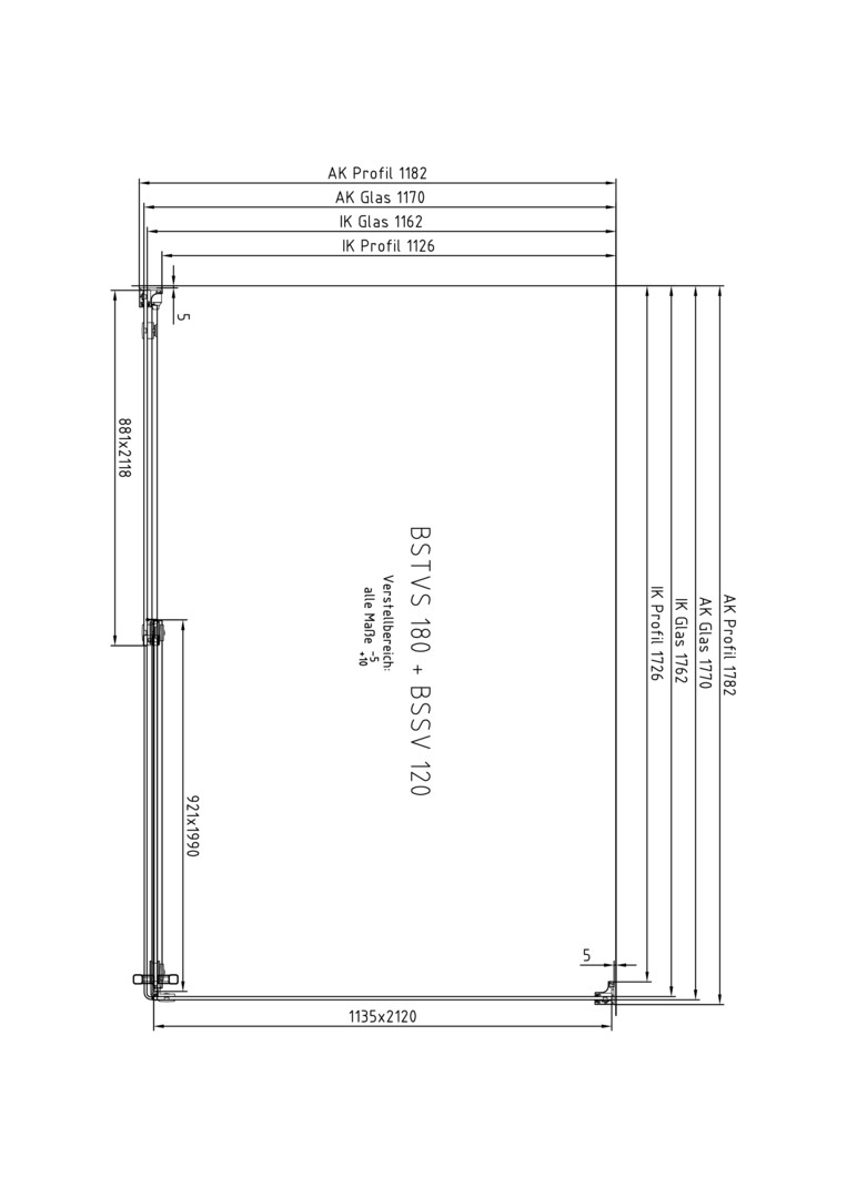 | Einbaubreite Tür für die Montage mit Seitenwand | 1785 - 1800 mm |