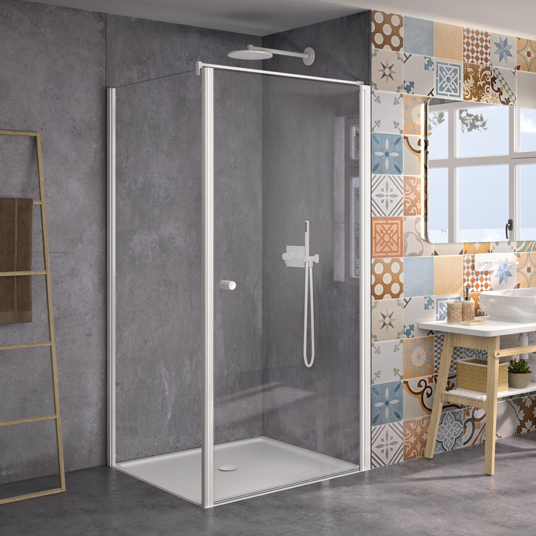 Glas 4 mm ESG transparent, Standardhöhe 2000 mm, Tür öffnet nach innen und außen, optional mit 4 mm hoher Wasserschwallleiste (nicht im Lieferumfang enthalten), PALM.free, PALM.fix, PALM.lift, PALM.invisible, PALM.isi-clean, optional PALM.nano, PALM.care