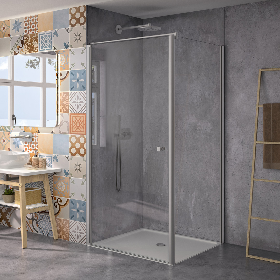 Glas 4 mm ESG transparent, Standardhöhe 1800 mm, Tür öffnet nach innen und außen, optional mit 4 mm hoher Wasserschwallleiste (nicht im Lieferumfang enthalten), PALM.free, PALM.fix, PALM.lift, PALM.invisible, PALM.isi-clean, optional PALM.nano, PALM.care