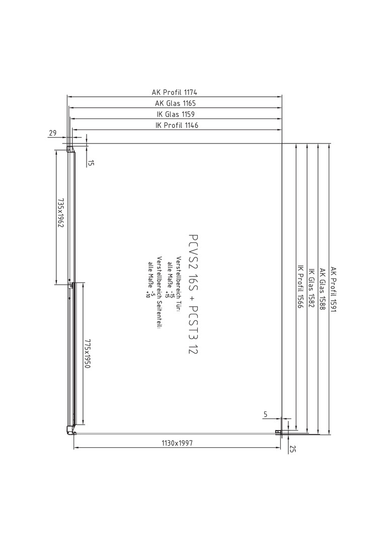 | Einbaubreite Tür für die Montage mit Seitenwand | 1585 - 1615 mm |