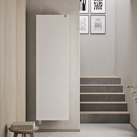 für Zentralheizung, mit Grundkörper in geschweißter Ausführung aus horizontalen Rundrohren 30 mm und vertikal nebeneinander angeordneten Rundrohren 18 mm in 2-reihiger Ausführung, plane Front mit kubistischen Seitenblenden kraft- und wärmeschlüssig mit Grundkörper verbunden, Front verblendet die komplette Ventilgarnitur für 50 mm Mittenanschluss für Vorlauf rechts und Eck-Anschluss mit Eurokonus für Klemmringverschraubung, nur der Bedienknopf ist sichtbar, Oberfläche pulverbeschichtet DIN 55900, Serienmäßiges Zubehör: Ventil und Anschlussgarnitur bestehend aus Eckverschraubungen DN 15 (1/2") mit AG DN 20 (3/4") Eurokonus für Rohranschluss mittels Klemmringverschraubung, Ventil und flexiblen Anschlussleitungen sowie Thermostat Puro verchromt, 1 Entlüftungsventil DN 15 (1/2"), 2 Befestigungen oben und 1 Abstandhalter unten, mit Schrauben und Dübel, Heizmedium Wasser, max. zul. Betriebstemperatur 95 °C, max. zul. Betriebsüberdruck 10 bar