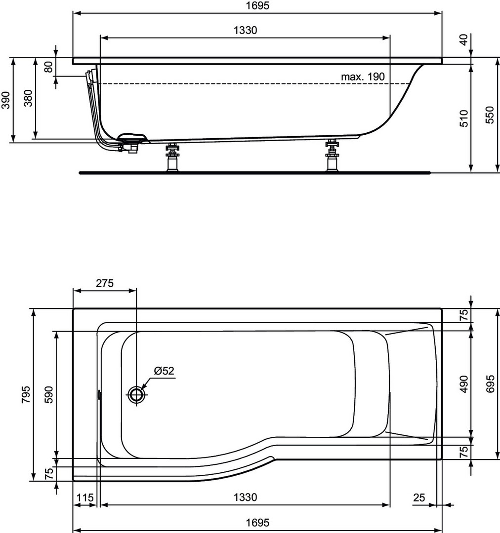 Sanitär-Acryl, mit Duschzone, glasfaserverstärkter Außenmantel, Einbau durch Unter- bzw. Abmauerung, Wannenfüße oder Wannenträger, einlaminierte Verstärkung des Wannenrandes und des Bodenbereiches, mit Überlauf (rund), Position Ablaufloch Fußende, Norm DIN EN 14516, DIN EN 198, DIN EN 232