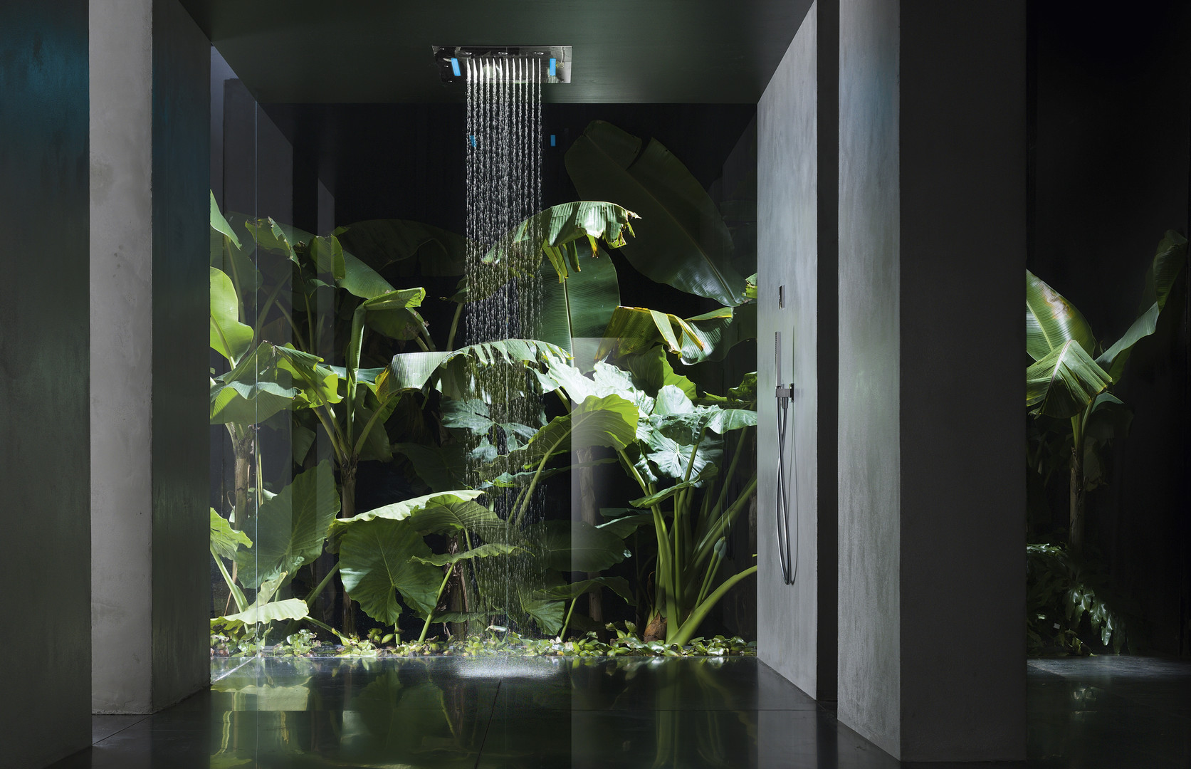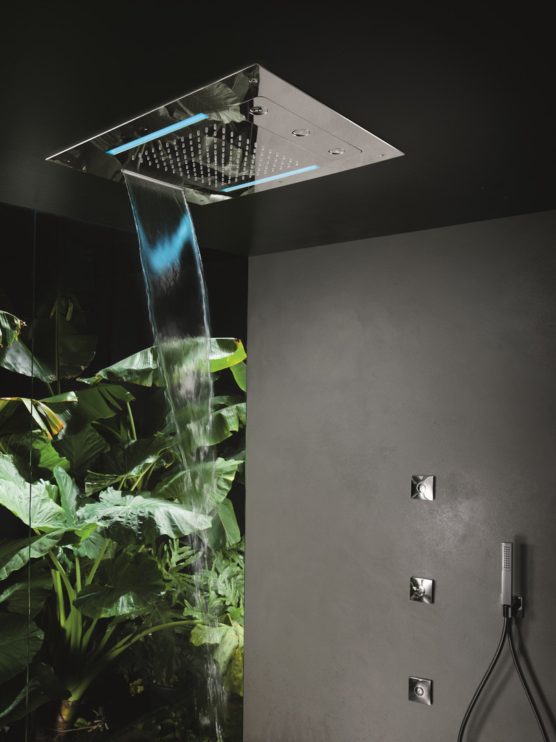 mit integrierter LED-Beleuchtung in separaten Lichtbändern, Transformator Spannungsversorgung 12 V, CLEAN EFFECT, 3 Spin-Jet Rotationsdüsen, Funk-Fernbedienung weiß, frei positionierbar, Einbaurahmen für Decke-Unterputz-Installation, Strahlarten Regen/Spin-Jet/Schwall, Durchflussmengen (bei 3 bar) Regenstrahl ca. 13 l/min, Spin-Jet ca. 13 l/min, Schwall ca. 17 l/min, die Ansteuerung der 3 Strahlarten muss über 3 Ventile erfolgen