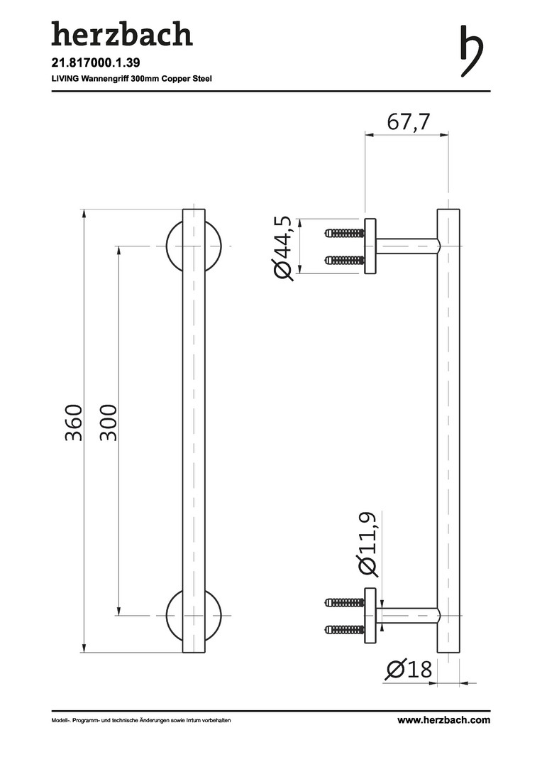 Herzbach Wannengriff Living 300mm, Wandmontage, copper steel