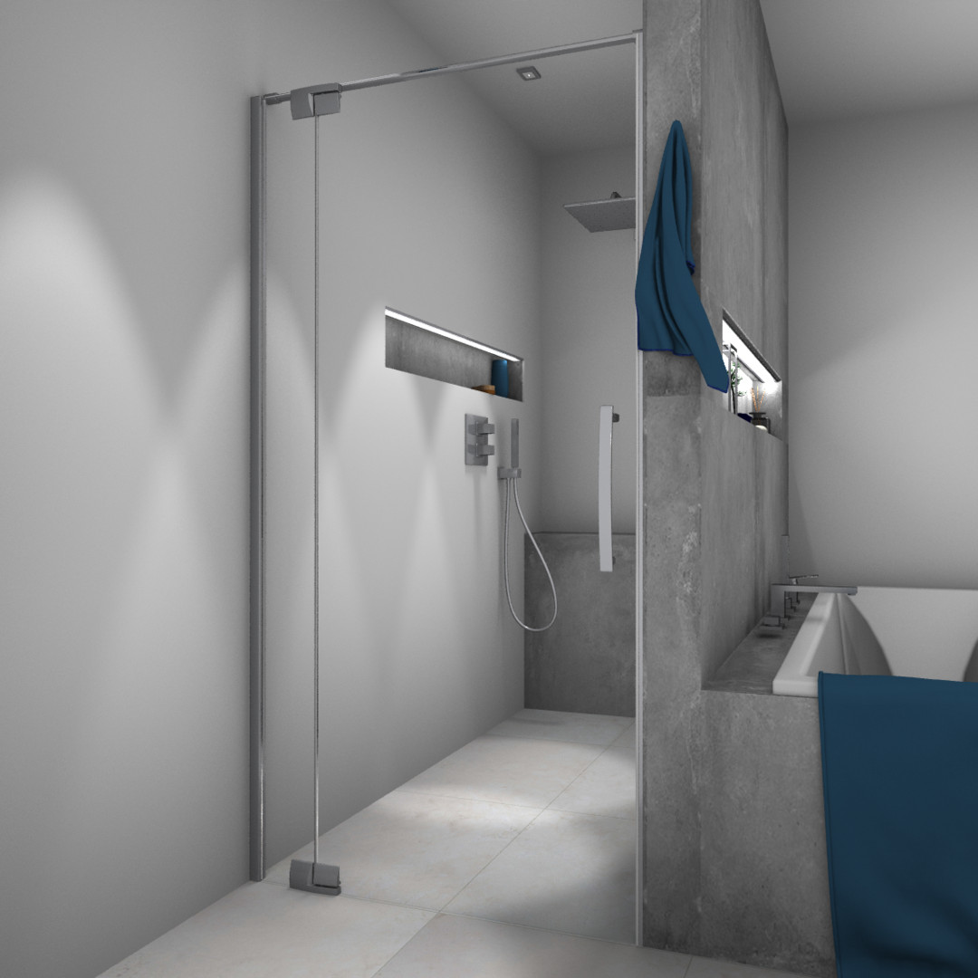 Glas 8 mm ESG, Standardhöhe 200 cm bzw. plus 3 cm Verstrebungsbügel, Tür öffnet nach Innen und Außen, alternativ mit 4 mm oder 15 mm hoher Schwallschiene, PALM.free, PALM.fix, PALM.lift, PALM.pro, PALM.isi-clean, optional: PALM.nano, PALM.care, PALM.magic, durchgehendes Wandbefestigungsprofil mit Verstellbereich