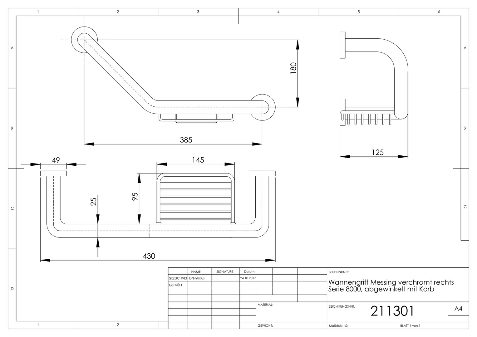 ASW Wannengriff Serie 8000 Länge 350 x 200 mm/Korb rechts, Messing verchromt, abgewinkelt, mit Seifenkorb