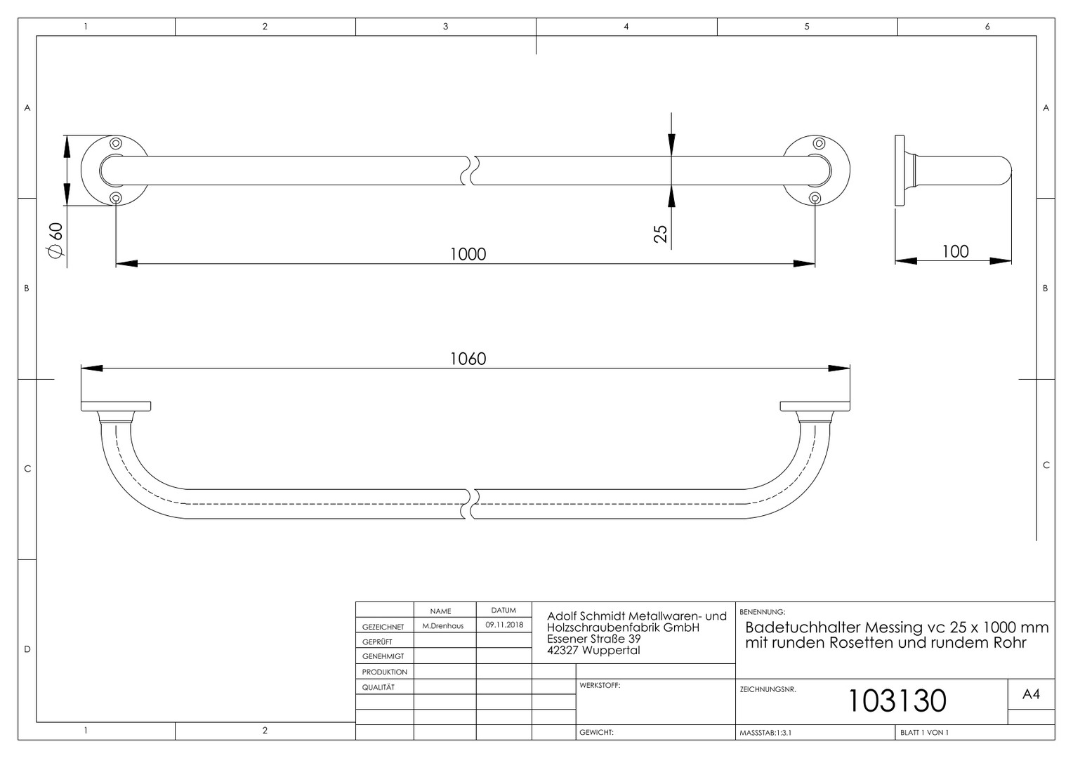 ASW Badetuchhalter Serie 1000 25 x 1000 mm, mit rundem Rohr/Rosetten, Messing verchromt