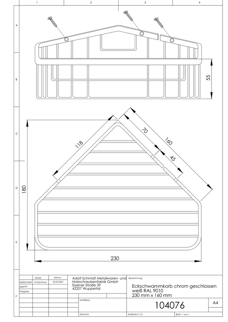 ASW Eckschwammkorb weiß RAL 9010, geschlossen, 230x160mm, Standard