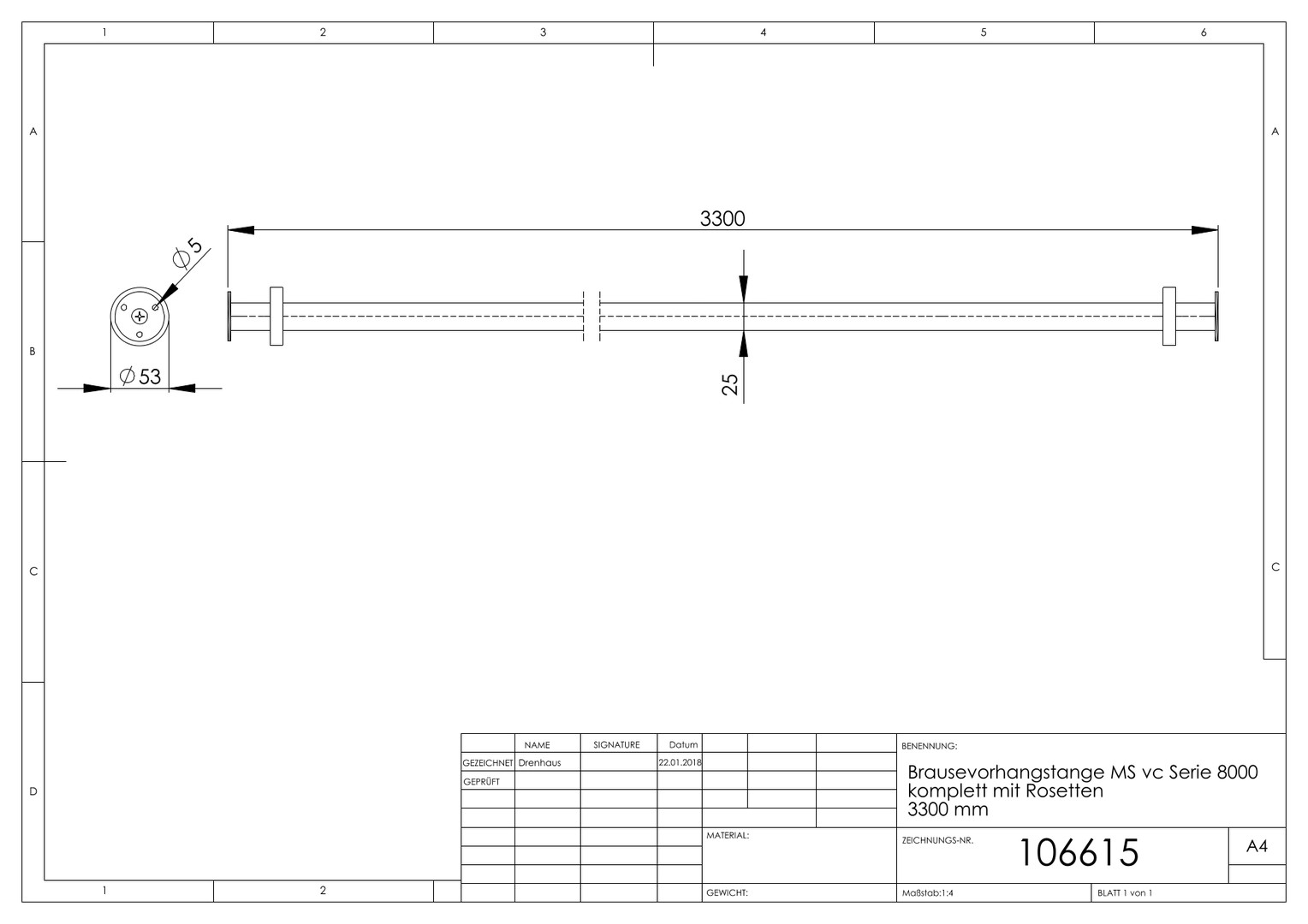 ASW Brausevorhangstange Serie 8000 3300 mm, d= 25mm, gerade Ausführung, Messing verchromt