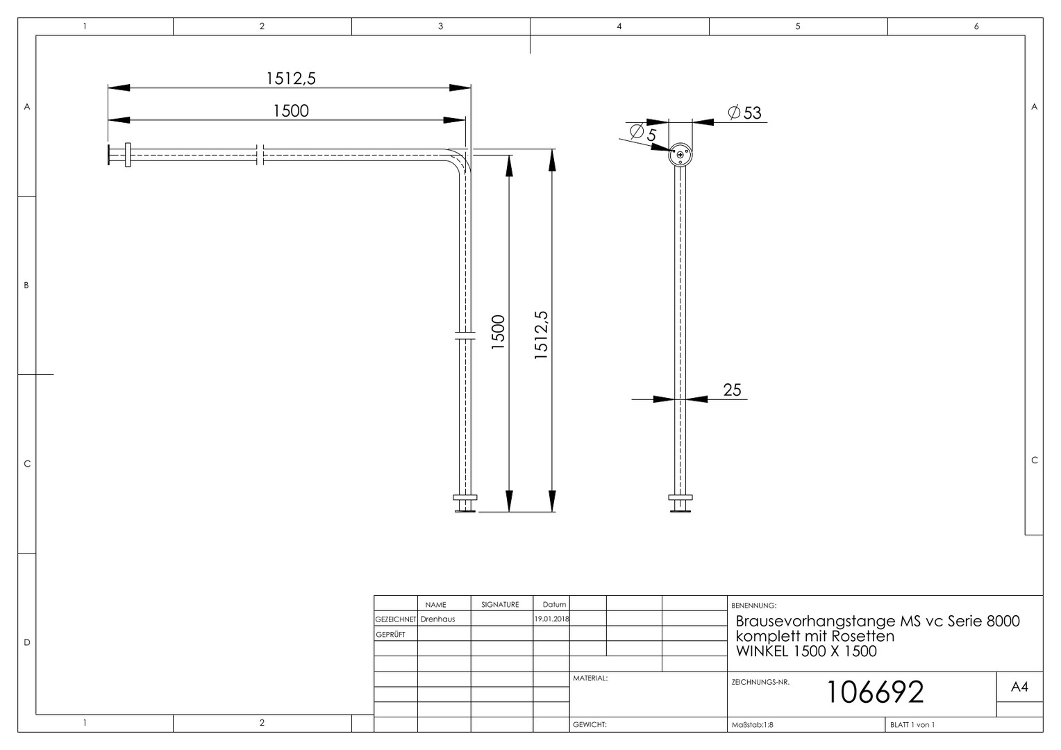 ASW Brausevorhangstange Serie 8000 1500 x 1500 mm, d= 25mm, Winkelform, Messing verchromt W381581