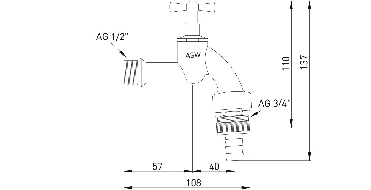 ASW Auslaufventil 1/2", Messing glanz verchromt, Rohrbelüfter, Rückflussverhinderer, Schlauchverschraubung W534110