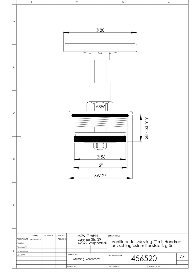 ASW Ventiloberteil 2", Messing roh mit Handrad, schlagfester Kunststoff grün