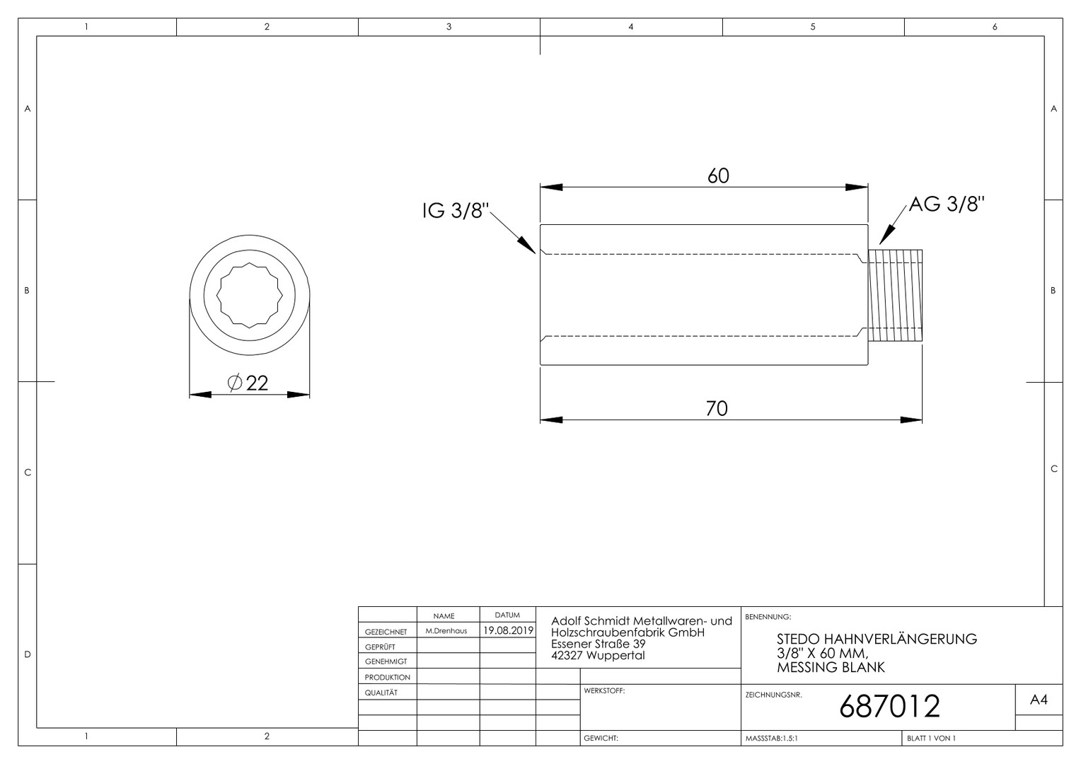 STEDO Hahnverlängerung 3/8" x 60 mm, CW617N mit Innenvielkant, Messing roh