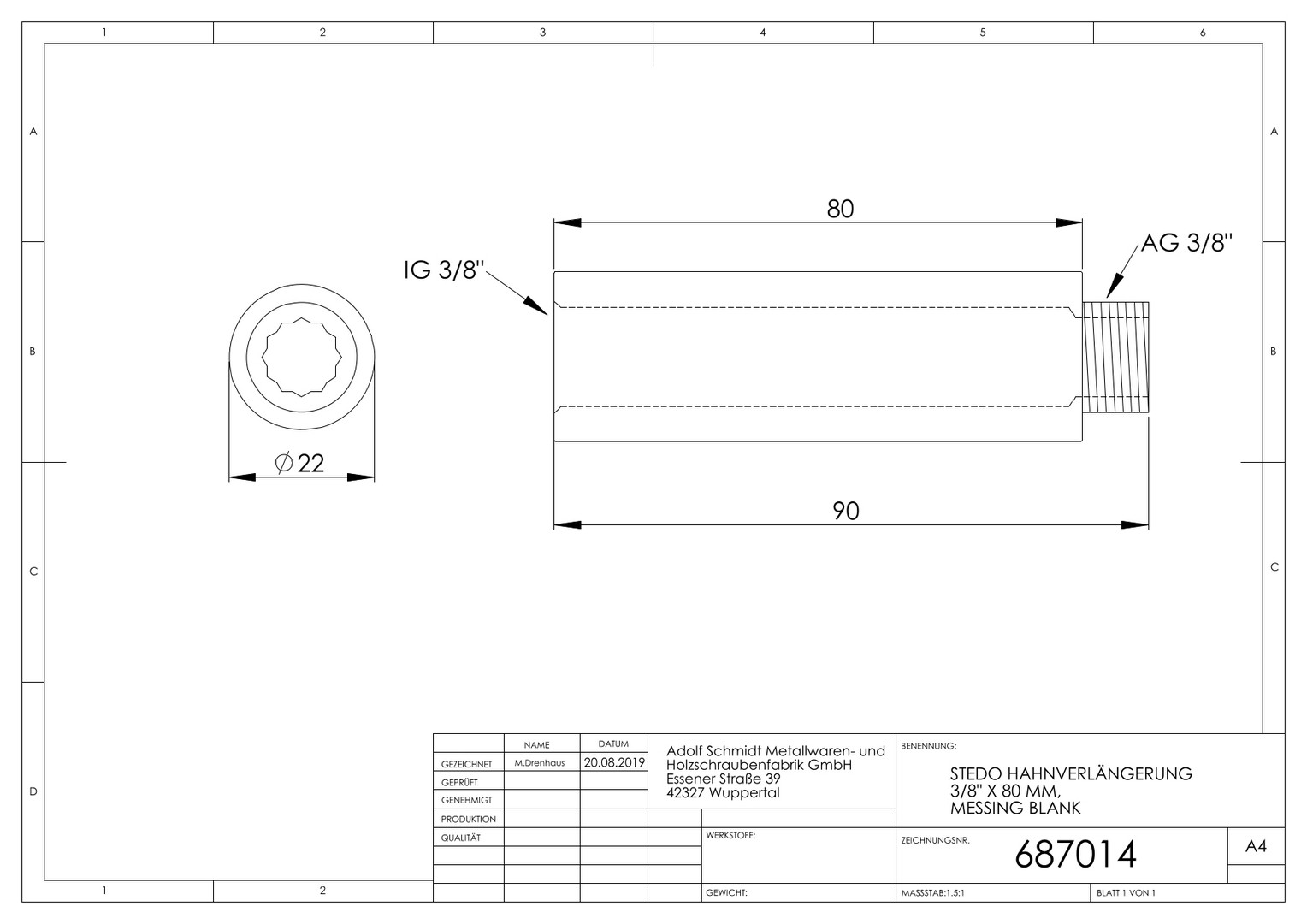 STEDO Hahnverlängerung 3/8" x 80 mm, CW617N mit Innenvielkant, Messing roh