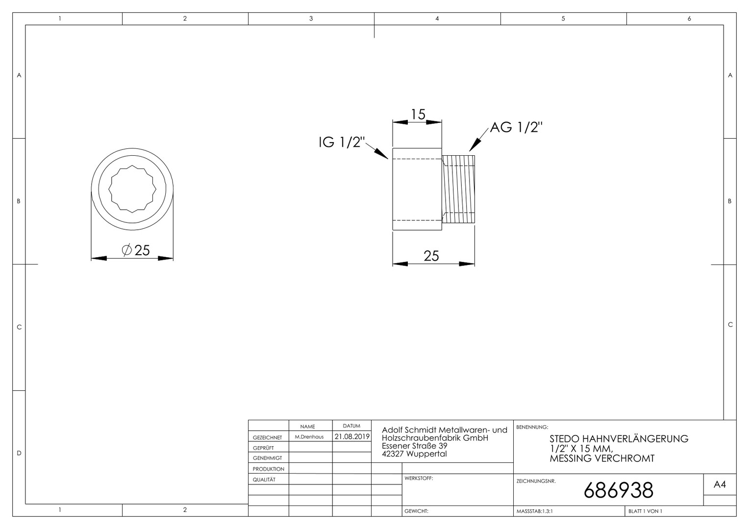 STEDO Hahnverlängerung Messing verchromt, CW617N mit Innenvielkant, 1/2" x 15 mm