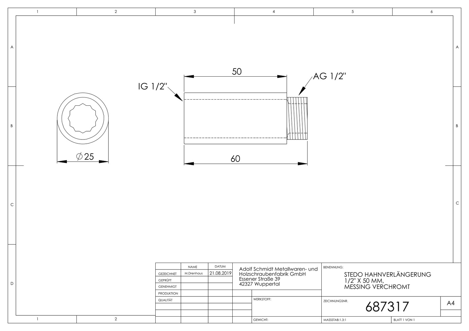 | Werkstoffgüte Anschluss 1 | CuZn39Pb3 (CW617N) |
