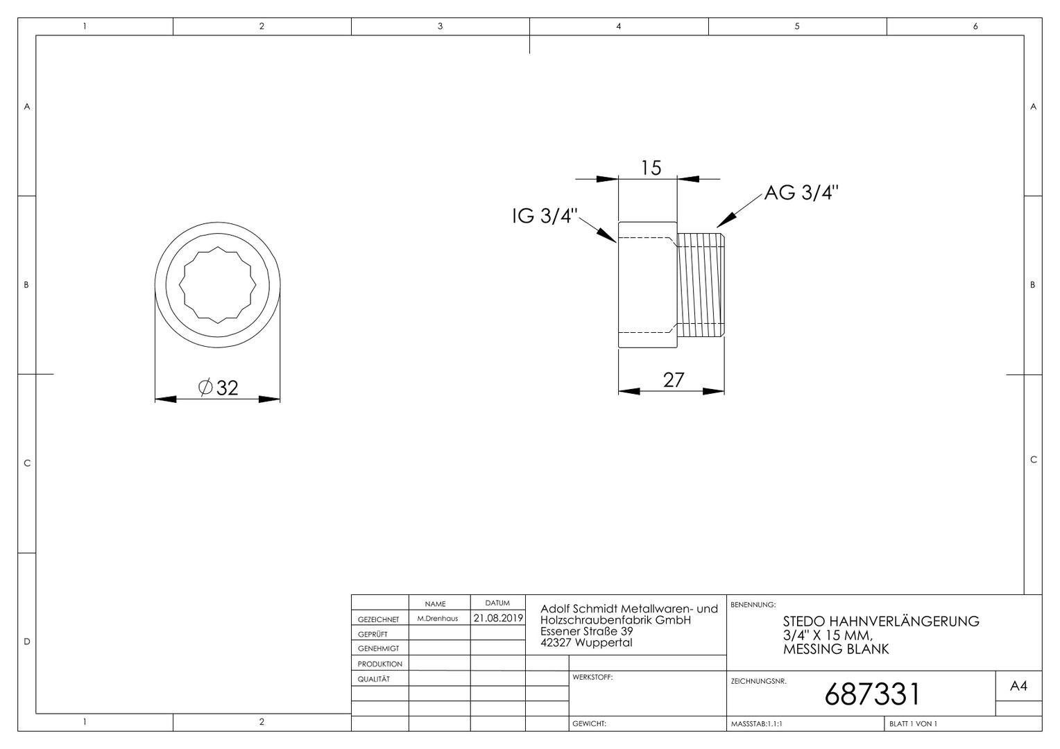 | Werkstoffgüte Anschluss 1 | CuZn39Pb3 (CW617N) |