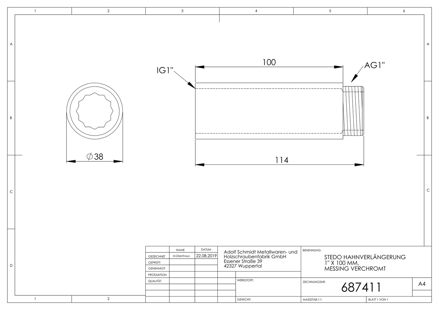STEDO Hahnverlängerung Messing verchromt, CW617N mit Innenvielkant, 1" x 100 mm