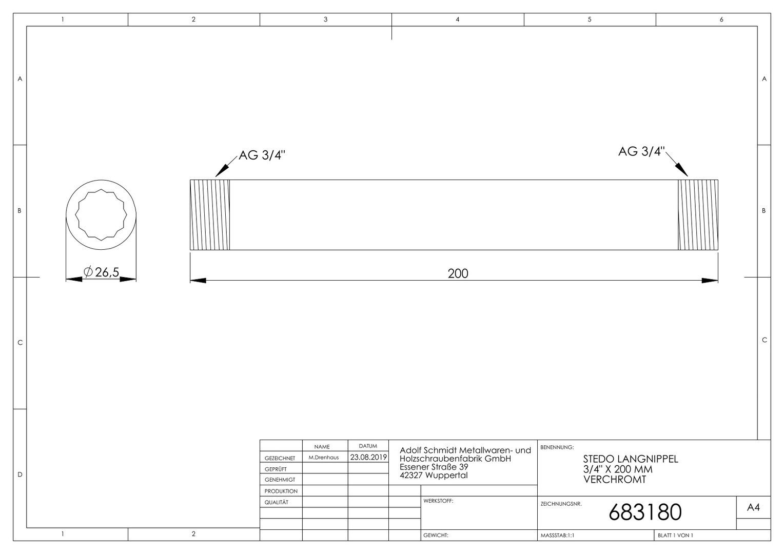 STEDO Langnippel 3/4" x 200mm, Messing verchromt, CW617N mit Innenvielkant