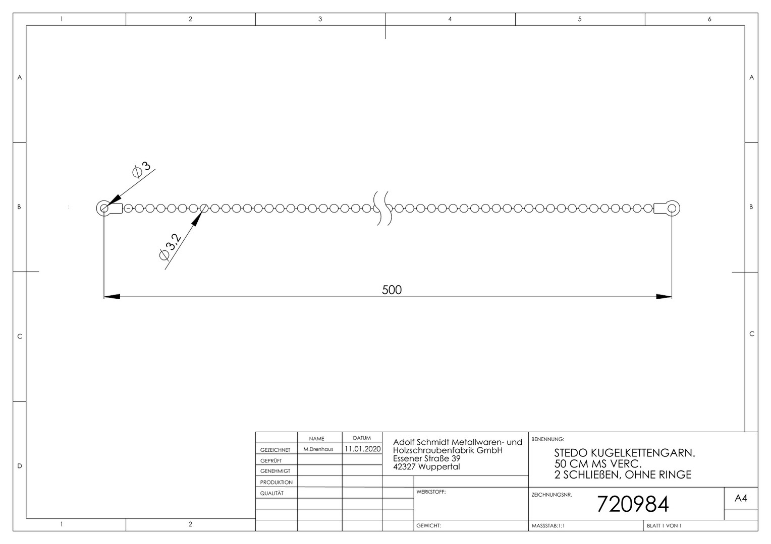 STEDO Kugelkettengarnituren 500 mm, d= 3,2mm, mit 2 Schließen, Messing verchromt