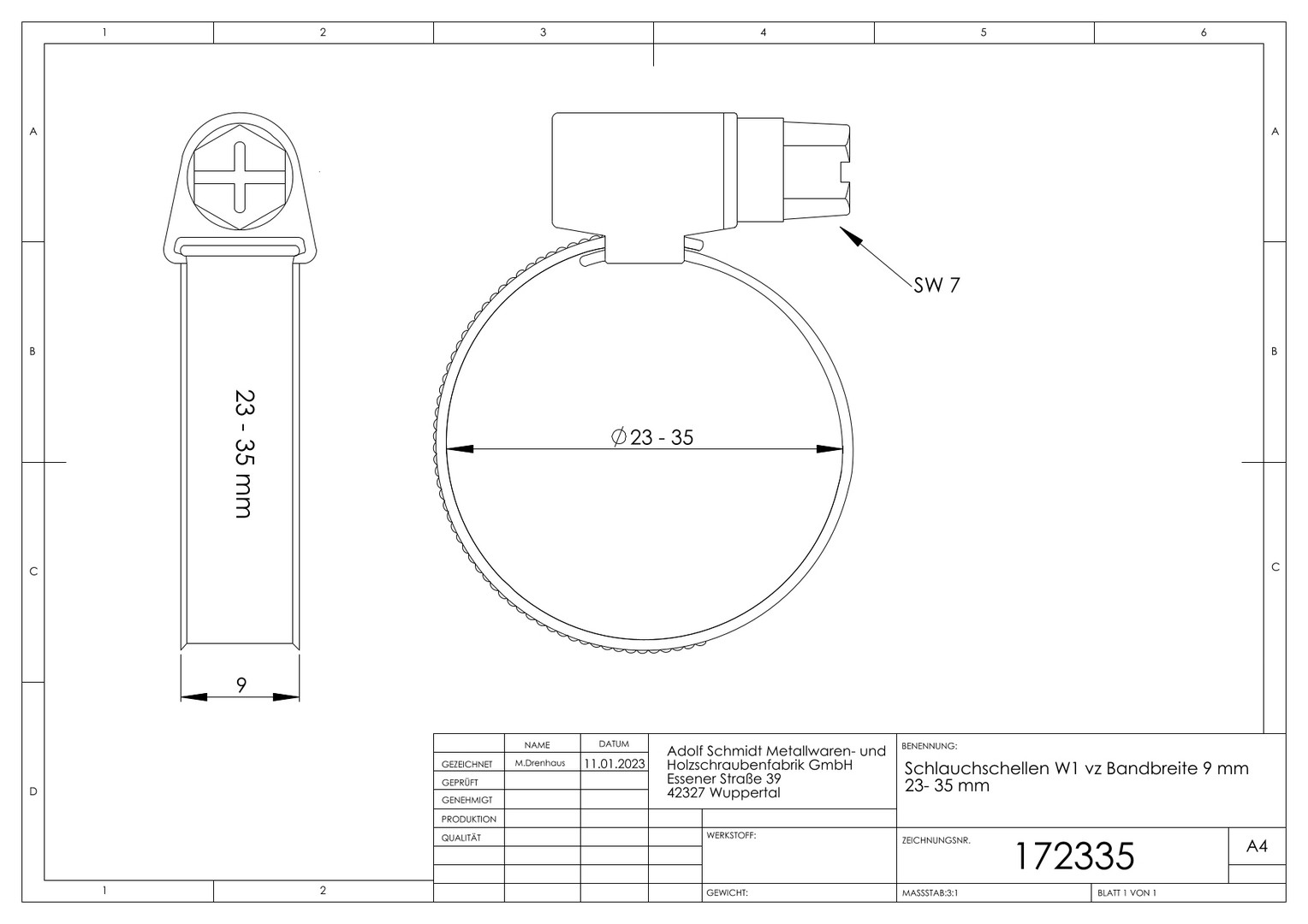 ASW Schlauchschelle W1 23-35 mm 3/4" + 1", Bandbreite 9mm, Stahl verzinkt
