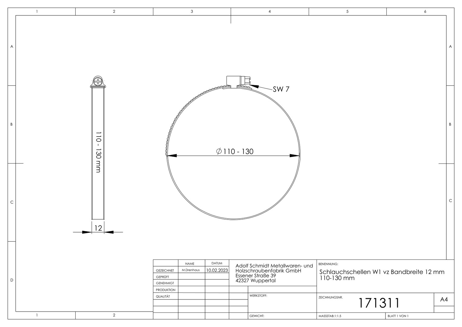 ASW Schlauchschelle W1 110-130 mm, Bandbreite 12mm, Stahl verzinkt